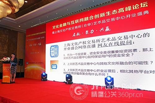 | 活動(dòng)效果: | 投資交易市場(chǎng)百花齊放,正如同證券、債券、期貨、現(xiàn)貨商品市場(chǎng)那樣,文化產(chǎn)業(yè)要素市場(chǎng)也必將成為我國(guó)金融業(yè)中的重要組成部分,是完善我國(guó)資本市場(chǎng)體系、響應(yīng)我國(guó)金融改革創(chuàng)新的重要一步。上海藝術(shù)品交易中心的開業(yè),將成為文化藝術(shù)品投資市場(chǎng)的先行者和領(lǐng)頭企業(yè),成為價(jià)值投資導(dǎo)向的財(cái)富新熱點(diǎn)、成為全民財(cái)富投資保值增值新方向,引領(lǐng)文化藝術(shù)品投資新趨勢(shì)、新未來。本次論壇由精鷹公關(guān)全程策劃執(zhí)行! |