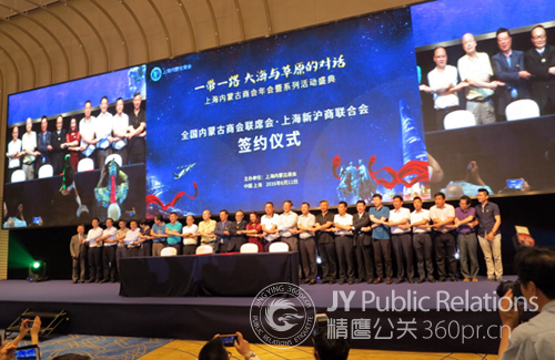 | 活動(dòng)效果: | 為進(jìn)一步拓展合作渠道,集聚整合更多發(fā)展資源,促進(jìn)滬蒙兩地共同發(fā)展,會(huì)上,全國(guó)內(nèi)蒙古商會(huì)聯(lián)席會(huì)與新滬商聯(lián)合會(huì)舉行簽約儀式,內(nèi)蒙古自治區(qū)人大常委會(huì)原副主任、全國(guó)內(nèi)蒙古商會(huì)聯(lián)席會(huì)會(huì)長(zhǎng)陳瑞清與杉杉控股集團(tuán)董事局主席、上海新滬商聯(lián)合會(huì)主席鄭永剛簽署團(tuán)體聯(lián)席合作協(xié)議,雙方一致同意建立緊密性的合作關(guān)系,互為聯(lián)席團(tuán)體,促進(jìn)交流合作,實(shí)現(xiàn)互利共贏。。本次活動(dòng)由精鷹公關(guān)全程策劃執(zhí)行! |