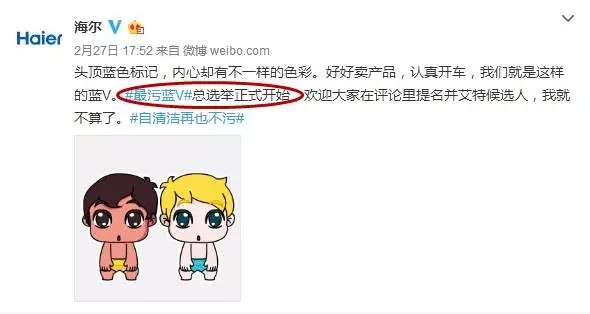 在微博上玩社會(huì)化營(yíng)銷,顯然海爾是繼杜蕾斯后的新星,閃耀的金色光芒普照了整個(gè)藍(lán)V團(tuán)體。但對(duì)昔日教主杜蕾斯卻毫無(wú)“敬畏”之意,近期,海爾就公開挑釁宣布要選舉藍(lán)V總統(tǒng)。