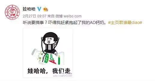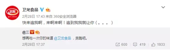那基于人來(lái)營(yíng)銷,又可以放飛自我,真實(shí)做自己的藍(lán)V翹楚就有衛(wèi)龍&娃哈哈。它們的微博日常如下: