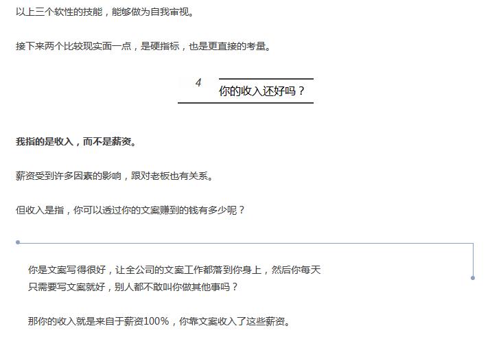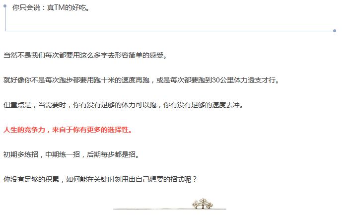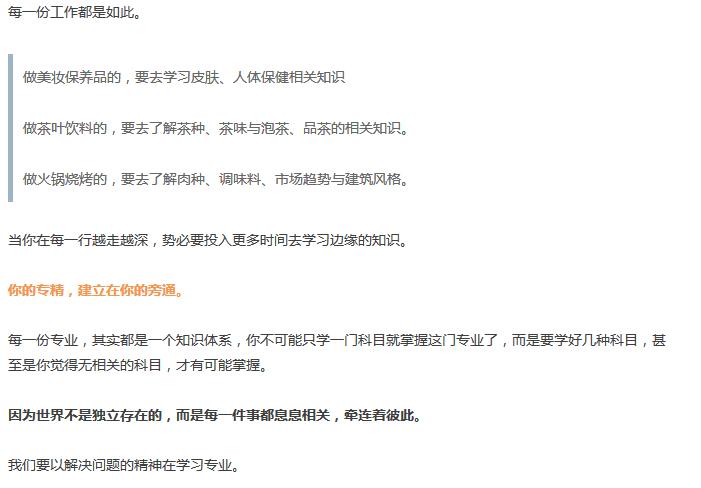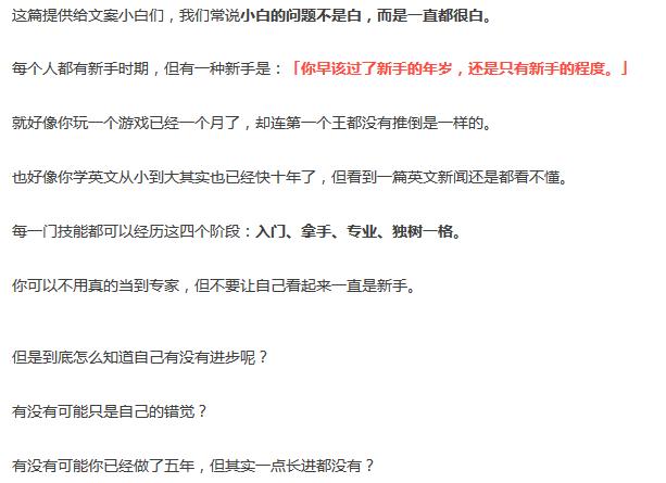 這篇提供給文案小白們,我們常說小白的問題不是白,而是一直都很白。每一門技能都可以經(jīng)歷這四個階段:入門、拿手、專業(yè)、獨樹一格。你可以不用真的當(dāng)?shù)綄<遥灰屪约嚎雌饋硪恢笔切率帧?/p>