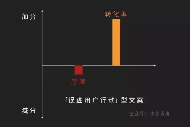 反過來,側重于轉化率的文案通常能短時間帶來直接效益,但(在用戶剛接觸到文案的時刻)卻是以犧牲“用戶態(tài)度”為前提的。