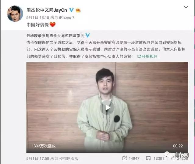 第二步,文字道歉之后,周杰倫錄制了一段道歉的視頻,并親自到安保指揮部,向演唱會期間執(zhí)勤的安保人員表示感謝,同時當面向這位安保人員道歉并取得原諒。