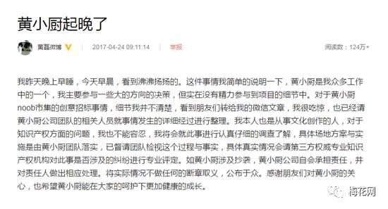 第二天早上,黃小廚品牌創(chuàng)始人黃磊發(fā)布個人聲明,這篇公關(guān)稿基本上算是正面典范。危機公關(guān)該有的姿態(tài)基本都涵蓋了。12小時內(nèi)回應,響應速度及時;“如黃小廚涉及抄襲,黃小廚公司自會承擔責任......將實際情況不做任何的斷章取義,公布于眾”這樣的回應也做到了態(tài)度端莊,保證嚴查到底。