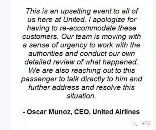 4月10日,美聯(lián)航官方發(fā)布了CEO Oscar Munoz 的一份簡短聲明,但顯然避重就輕,只提到對于“重新安置的乘客”的道歉,并沒有對于這位受傷的亞裔男子的道歉。