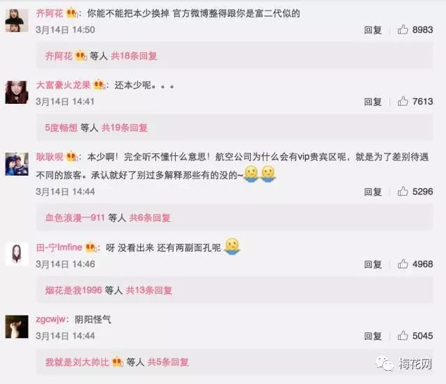 事后,香港航空的官方微博在17個半小時后給出了對于賭王兒子微博投訴的官方回復?;貞乃俣炔⒉患皶r,行文也極其浮夸,尤其是自稱“本少”,在香港賭王兒子面前更顯得有點搞笑。