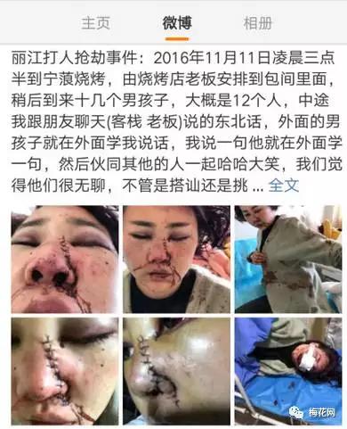 今年1月,麗江女子被打毀容事件鬧得沸沸揚揚。女網(wǎng)友@琳噠是我 深夜發(fā)微博,稱自己去年11月11日在麗江某燒烤店就餐時,遭數(shù)名當?shù)啬凶犹翎厷?,被碎酒瓶劃臉毀容,男子離開時還搶走女子及同行人財物、手機,并揚言不怕警察,隨便告。