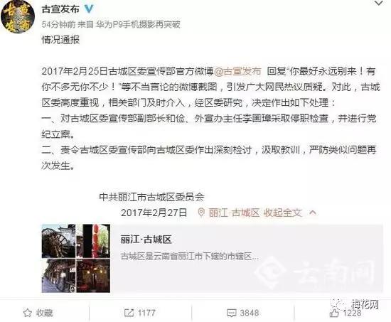 2月25日,當有網(wǎng)友評論說“永遠不會去的地方就是麗江”時,云南麗江市古城區(qū)委宣傳部官方微博 @古宣發(fā)布 竟回復“你最好永遠別來!有你不多無你不少!”