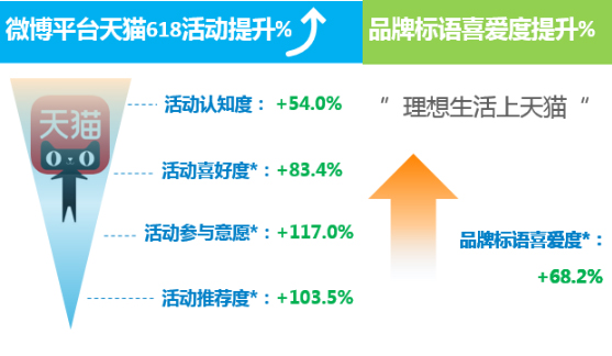 由尼爾森提供的《天貓618微博活動(dòng)數(shù)字品牌效應(yīng)報(bào)告》顯示,這次微博營(yíng)銷實(shí)現(xiàn)了高達(dá)50%品牌提升率。在此次618微博營(yíng)銷中,天貓618活動(dòng)認(rèn)知度、喜好度、參與意愿、推薦度均有極大增長(zhǎng),廣告效果顯著;對(duì)"理想生活上天貓"品牌標(biāo)語的喜愛度也有顯著提升。在激烈的電商廝殺中,天貓穩(wěn)穩(wěn)的占據(jù)了618的主場(chǎng),品牌與618的關(guān)聯(lián)度遠(yuǎn)超競(jìng)品。