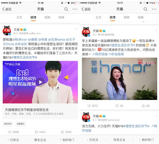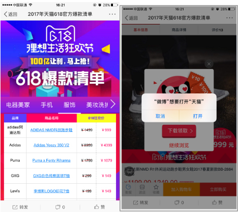 微博用戶發(fā)布指定關(guān)鍵詞博文:天貓/618/理想生活,博文下方便會(huì)自動(dòng)附帶爆款清單入口,主會(huì)場(chǎng)入口實(shí)現(xiàn)信息流內(nèi)蔓延,語義櫥窗連續(xù)三天累計(jì)曝光2.5億次。