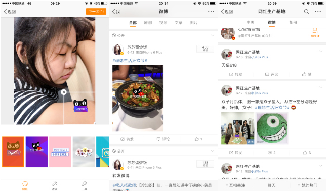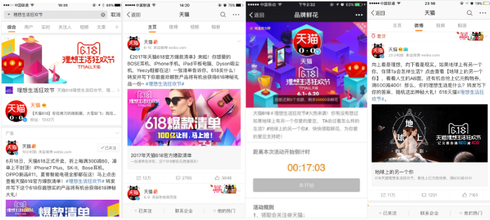 天貓的一系列推廣文還進(jìn)行占領(lǐng)發(fā)現(xiàn)頁核心位置,借由大card展示視覺沖擊、可分別跳轉(zhuǎn)指定博文進(jìn)行霸屏沖擊。