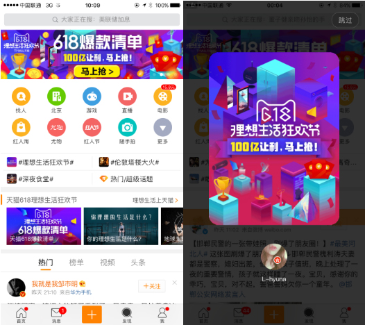 微博首次實(shí)現(xiàn)定制化展示,發(fā)現(xiàn)頁浮層千人千面,通過提取用戶頭像及昵稱,與天貓主視覺合體,增強(qiáng)用戶代入感,打造全民參與的氣氛,又一次將用戶體驗(yàn)再升級(jí)。