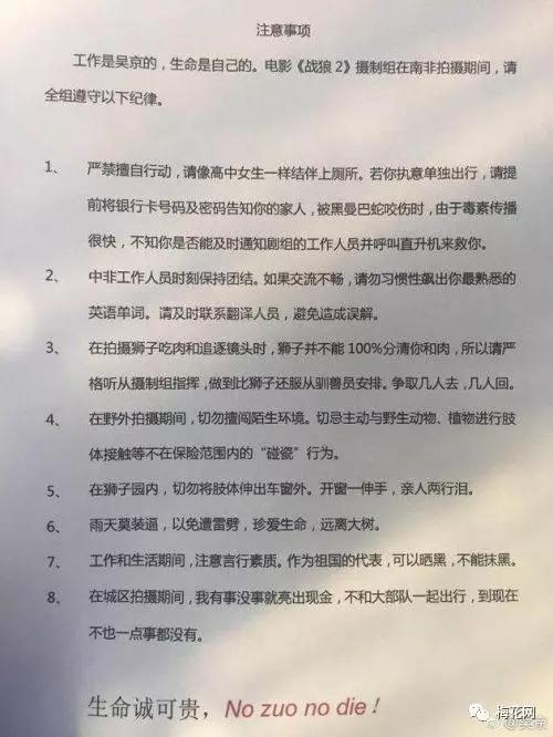 從去年6月開拍,吳京就時常在微博上發(fā)布電影拍攝的細節(jié)。其中有一次吳京用一張貌似簡單的"注意事項"成功引燃話題,吸引了多方網友的關注。