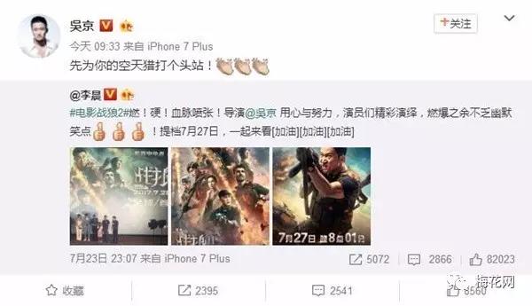 7月24日,吳京轉發(fā)了李晨的一則微博,為李晨的新電影加油打氣,而李晨發(fā)布的微博內容則是為吳京的《戰(zhàn)狼2》宣傳。