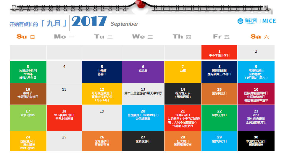火熱的8月走了,涼快的9月終于來了。營銷人快跟著梅小花來關(guān)注一下9月公關(guān)日歷吧。讓我們準(zhǔn)備好,迎接9月節(jié)點(diǎn)們一個一個一個的到來……