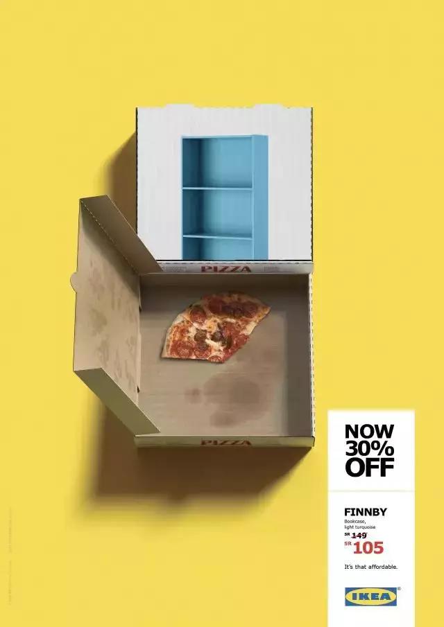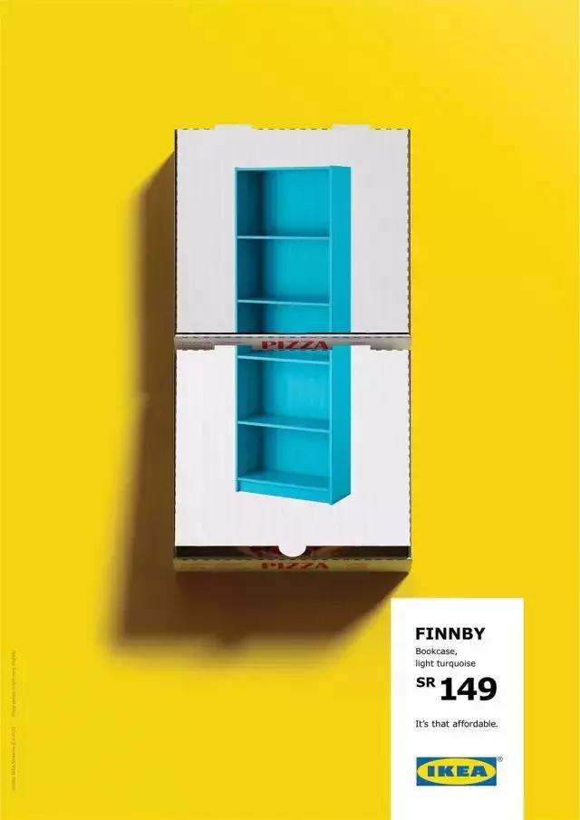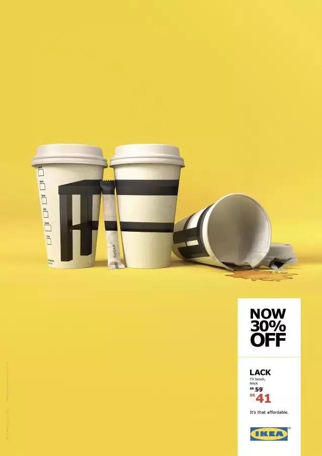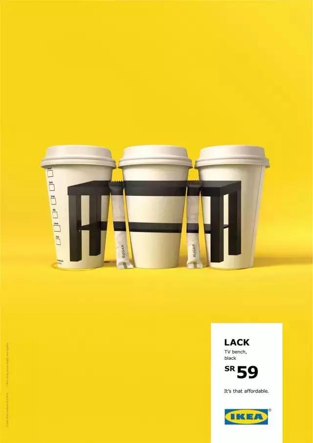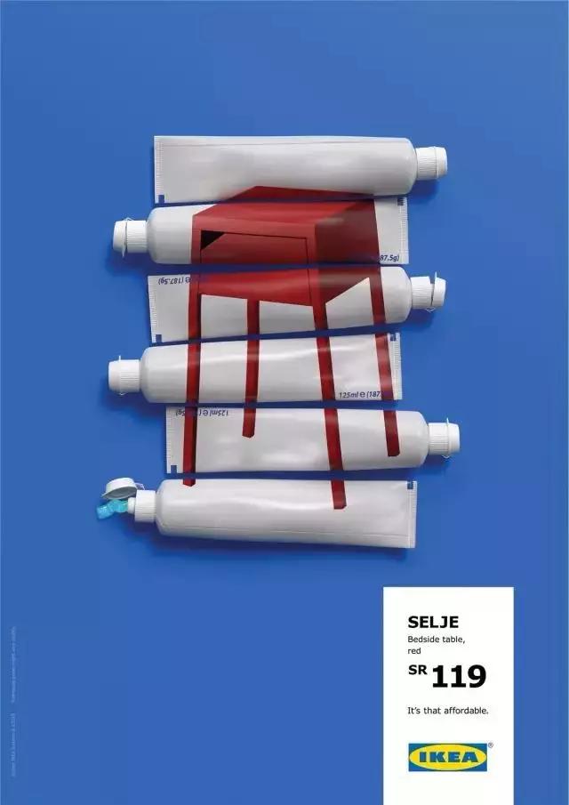 比如宜家有一個(gè)獲得了很多獎(jiǎng)項(xiàng)的創(chuàng)意宣傳。他們的產(chǎn)品物美價(jià)廉,但是時(shí)間久了大家也就對(duì)此沒有那么強(qiáng)烈的認(rèn)知了。這個(gè)時(shí)候他們做了一組海報(bào),用六支牙膏就能買到一個(gè)抽屜柜,兩盒披薩就能買到一個(gè)書架,三杯咖啡就能擁有一個(gè)長(zhǎng)條凳。讓人驚嘆:So cheap!這讓他們銷量大漲。在打折的時(shí)候,他們抽掉了幾管牙膏,打翻了一杯咖啡,告訴大家現(xiàn)在更便宜了。